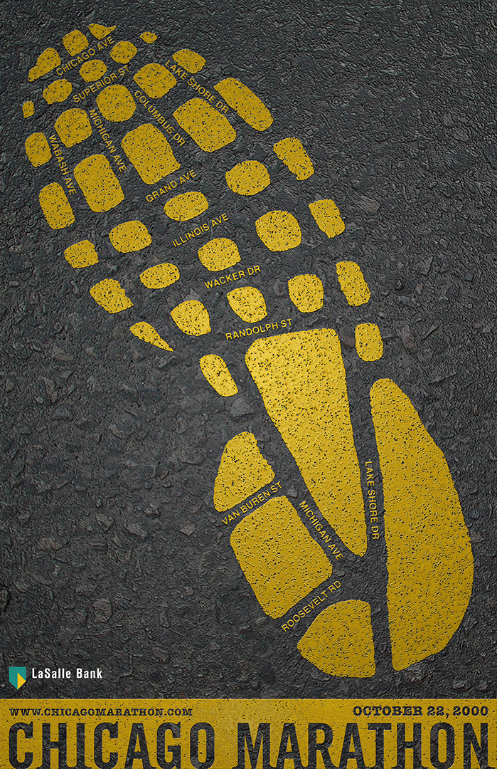 Branding the Chicago Marathon was inspired by footprints. Combining the runner's footprint with the streets of Chicago created a bold, attention-getting graphic. This concept is sure to get the response, "this branding has sole!"